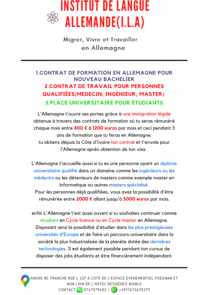 Dès ton arrivée en Allemagne l’institut de langue reste disposer à continuer à t’offrir des services dans tes demarches administratives sur place permettant ainsi ton intégration rapide et favorisant aussi ta reussite éclair dans l’atmosphère estudiantine et proffessionelle sur place. au coté de nos partenaires sur place nous t’apportons un suivi et un conseil pedagogique sur les orientations et les opportunité qui s’offrent à toi et dont l’Allemagne dispose. une fois arrivé en Allemagne n’hesite pas à te rapprocher de l’institut de langue pour plus toutes questions et renseignements dont tu aura envi de recevoir un eclaircissement. car rien ne tue comme le manque d’information en Europe et plus particulièrement en Allemagne.